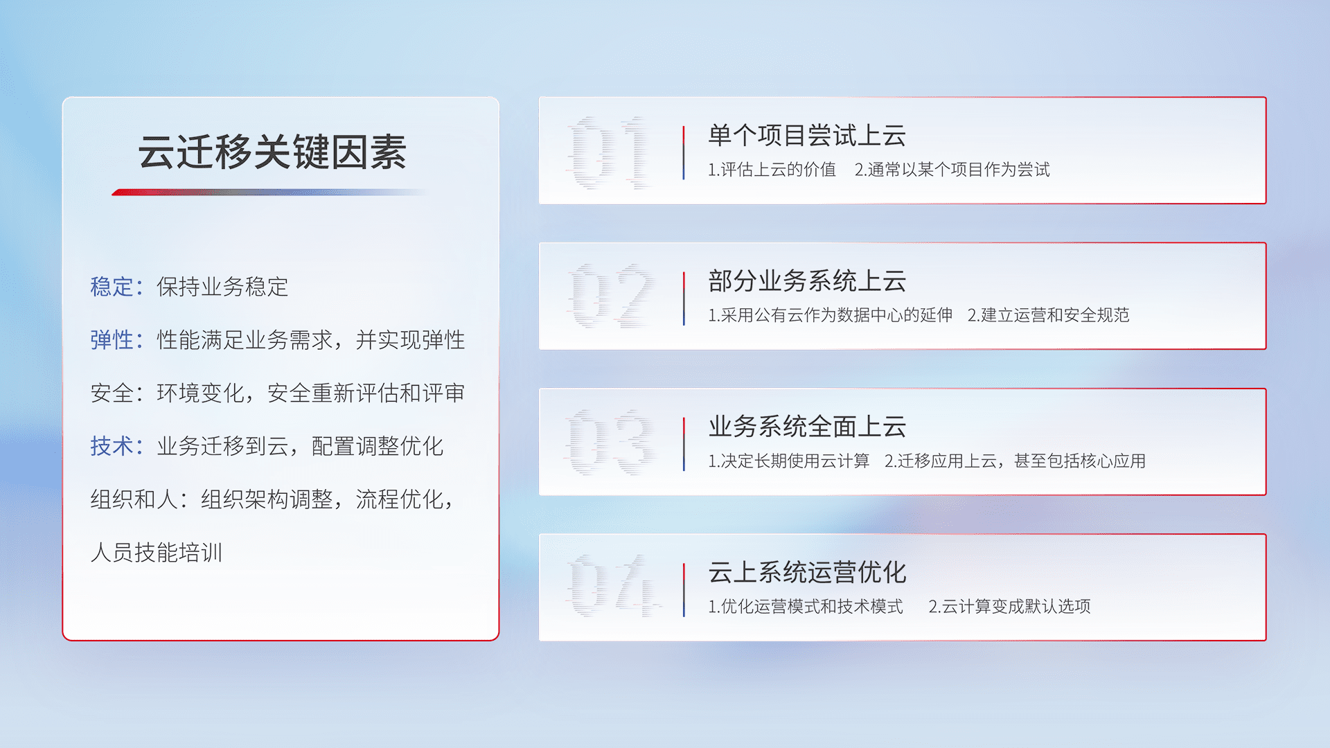 结合实际业务,,,从规划设计、、云平台选型、、、、云原生改造、、、数据迁移、、、、集成交付,,,迁移全过程为客户识别最佳上云路径,,,做好风险识别管理,,设计网络架构、、、身份权限、、安全审计合规、、、、操作审计、、、、日志审计、、、监控告警策略、、、、多站点容灾设计等,,,对云上基础设施进行整体规划,,,提升IT治理水平,,,以满足弹性、、高可用、、、、高性能的需求。。