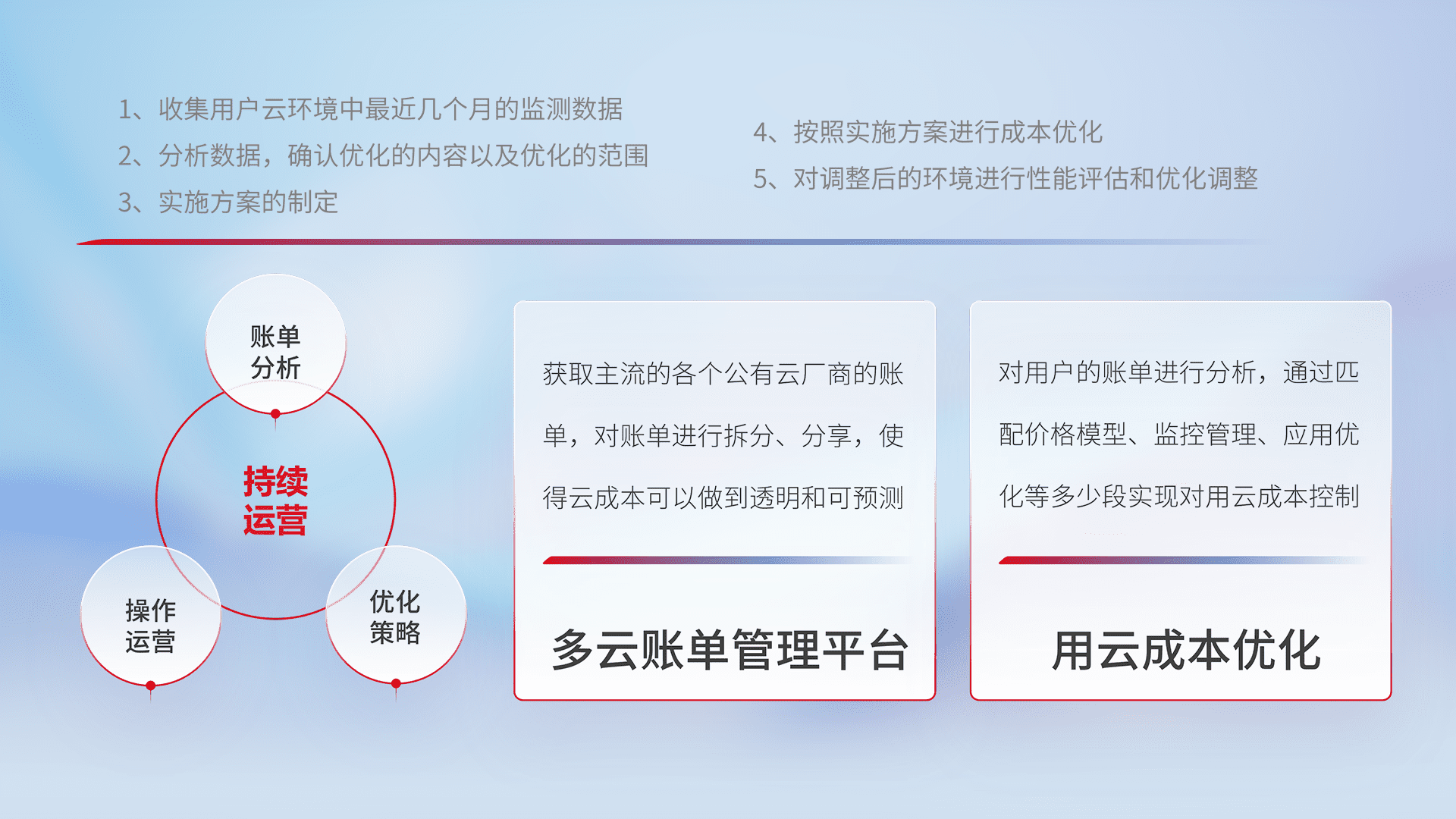 通过多云纳管,,以统一的资源数据模型把客户的云资源进行抽象和封装,,进而实现对多云资源的统一操作,,保障云资源管理的可靠性、、、稳定性与可用性。。。量身定制化运维内容,,,,配置、、开发运维、、、、补丁管理、、备份、、监控、、、认证和访问管理、、、、审计和日常巡检等,,,,保障在用云过程中的可靠度,,,,稳定度以及高可用率。。