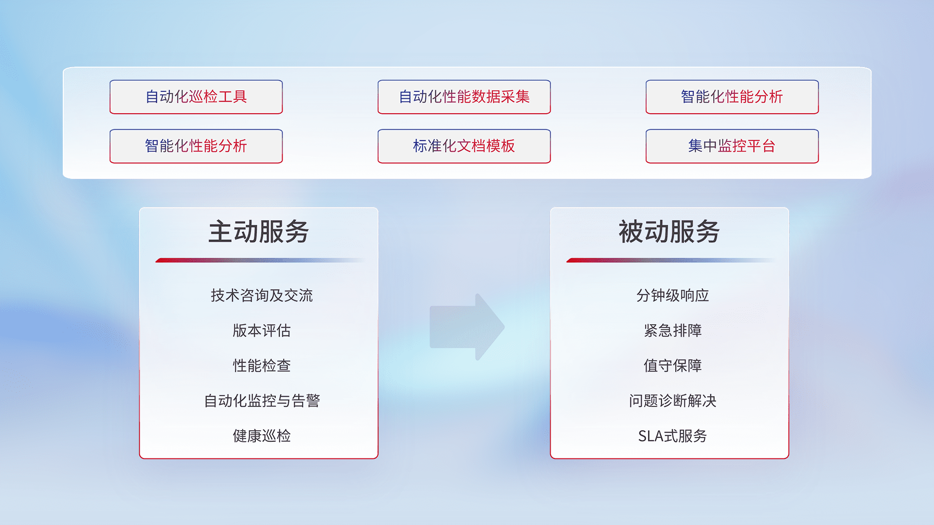 智能化工具和标准化文档,,保障服务质量,,,提供主动服务(包含技术咨询、、版本评估、、、、性能检查、、、、自动化监控与告警、、、、健康巡检)和被动服务包含(分钟级响应、、紧急排障、、值守保障、、问题诊断解决、、、SLA服务)。。。